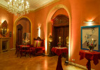 Kronleuchter, reich geschnitzte Türstöcke und rote Samtvorhänge