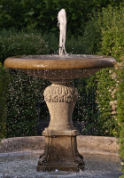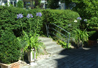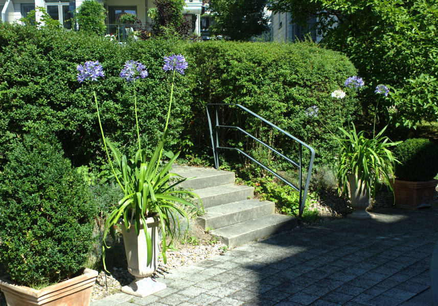 Erinnert an eine "Terrazza" in der Toscana, mit Blick auf die munter plätschernde Fontäne und den Mittelmeer-Zypressen. Ein wunderbarer Ort, um seine Gäste zu empfangen und ihnen ein Gläschen Prosecco mit kleinen Häppchen zu kredenzen oder auch mit Kaffee und Kuchen zu bewirten.